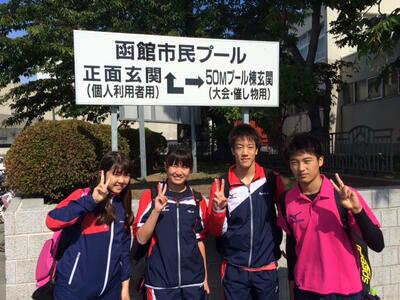 また、この度は富樫氏(37期)・横山氏(39期)が代表として本校プールにわざわざお越しになり、水泳部OB・OG有志の方々からのご厚志をいただきました。さらに函館在住OGの大越氏(39期)も会場まで応援に駆けつけていただきました。なお、ご厚志は選手たちの栄養費として有効に使わせていただきましたこと、この場を借りてお礼とご報告を申し上げます。