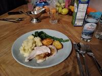 夜ご飯はチキンとマッシュポテト、ハッシュドポテト、ブロッコリーに、鶏の骨から出汁をとって作ったソースをかけていただきました。